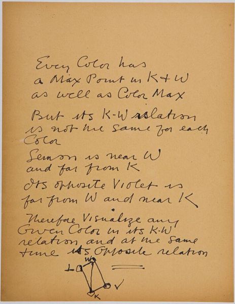 Curator: Here we have “Art Theory Text with Sketches” by Stuart Davis. Although undated, it likely comes from around 1928, judging by the “28” inscribed at the top. It's on paper, and features both text and rudimentary sketches in ink. Editor: My first impression is that this feels like a page torn from an artist's notebook. It's raw, personal, and invites us into the artist's thinking process. I’m also struck by the tension between the rigid, almost scientific language, and the whimsical, playful quality of the sketches. Curator: Davis, deeply engaged with the avant-garde, was trying to articulate a distinctly American art theory. He sought a visual language reflective of modern, urban life, pulling from jazz and advertising. Editor: It's interesting to see him grapple with these abstract ideas of value and reality. It feels connected to the broader societal shifts of the early 20th century, questioning old structures and searching for new meaning amidst rapid change. Curator: Absolutely. Davis’s work constantly reflected the socio-political landscape, challenging traditional art hierarchies. It shows his commitment to integrating art with everyday life. Editor: Seeing it this way transforms the work from a simple sketch into a profound exploration of art's role in shaping our understanding of reality. It also shows how art can push conversations about complex issues of identity, culture, and purpose.