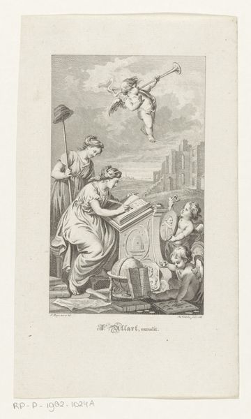 Editor: This is "Putti Studying a Sheet of Paper," an engraving by Jacob Folkema from 1761. I find it incredibly charming – these little putti are just so expressive. It’s a flurry of wings and tiny hands, all gathered around what I presume is this very important document. What do you make of it? Curator: Well, these putti— cherubic children — were often used allegorically. This image is so typical of the Baroque, bursting with energy even within its disciplined lines. I wonder what exactly captures their attention in this image. Editor: It looks like they're gathered around this stone block holding the paper, each focused on something different. The one on the bottom is even carrying a painter’s palette, how interesting! Is the Baroque usually this... playful? Curator: Playful but structured! Look at how Folkema balances the composition. See that the light and dark areas form a compelling pattern? Even the textures create contrast that helps to define these chubby putti. Editor: Right, like how the delicate shading on the cherubs really contrasts with the solid, darker stone beneath them. And, this one putto is being crowned with laurels, holding onto that horn, this engraving really is full of symbols isn’t it. It really invites me to start inventing stories about it! Curator: Absolutely. That invitation to narrative is key! And in Baroque art, those narratives were often meant to teach or inspire. What story will you invent based on it? Editor: Perhaps, a reminder of learning as the highest and most playful of pursuits! Looking closely like this makes me want to seek out all sorts of art I've glanced over before. Curator: Indeed, to be like those putti, poring over art, unlocking its meanings… it's a glorious endeavour!