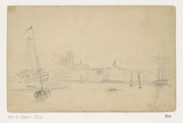 Curator: This is John Singer Sargent's "View of Venice from the Canal," a graphite sketch rendered on paper. It evokes a fleeting impression of the city. Editor: Immediately, I’m struck by the sketch's quietness. The muted tone and the spare lines create a sense of stillness and introspection. What stories does it conceal? Curator: Sargent frequently depicted Venice, a city rife with social and political complexities during his time. It served as a backdrop for both the elite and the working class. Editor: It's interesting how Sargent uses such minimal lines to suggest so much. The gondola, the distant architecture, and the boats—they all hint at the layers of Venetian life, yet remain undefined. The artwork lacks the representation of the labor conditions required to maintain that life. Curator: Indeed. He's less interested in a detailed rendering, and more focused on capturing the essence of the place. Perhaps that relates to the privileged lens through which he viewed the city. Editor: Perhaps. Thinking about it now, the sketch feels incomplete, prompting us to question what's left unsaid. It's a powerful testament to the selective nature of representation. Curator: Precisely. Sargent provides us a glimpse into a world, but it’s up to us to grapple with the omissions and the questions that arise.