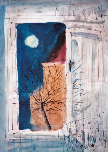 Curator: Here we have "Oil," an acrylic on canvas created in 1989 by Vudon Baklytsky. What's your immediate reaction? Editor: Oof, that's intense! I feel a weird sort of serenity mixed with…apocalypse? Is that a word? It's like the end of the world as painted by someone determined to stay optimistic. The colors, they fight each other but somehow make a sunrise at the same time. Curator: An interesting observation. Structurally, one notices immediately the crude impasto layering. The texture is so pronounced it challenges the conventional flatness of painting. Note how the graffiti art, neo expressionist marks disrupt any sense of idealized landscape. Editor: Totally. It’s like he was building the world from scratch, then immediately decided to mess it up, which…mood. See the little windows askew. Gives me the vibe of a child who has played too much with their construction toys. Are we demolishing or constructing here, what's the architect saying? Curator: Indeed. The geometric forms fight any clear visual interpretation, as we also contemplate abstraction, with each deliberate scrape of matter-painting application serving a purpose. The stark black tree against the colorful sky—a visual confrontation of life and decay. Editor: That tree is the heart of the whole shebang, isn’t it? Black as night, but tipped with those white flecks—like it’s fighting to stay alive, catching the last rays of sun…or the first hints of nuclear winter? I wonder what was on Baklytsky’s mind at the time, the late 80s. I can almost taste perestroika in this painting! Curator: Precisely, an engagement with late 20th-century disillusionment is strongly in play. Its semiotic echoes call to mind the transition in society at that time; its impact still has purchase today. Editor: Well, the genius lies there for me: it might depict a specific period and circumstance, but I feel as though it transcends to a kind of feeling of change itself—a permanent impermanence. The brush strokes on that hilltop might become waves, who knows? Maybe tomorrow it will be about saving a capsized vessel. It is pure magic. Curator: It is a conversation of material, color, and intent; the artist has, quite successfully, engaged a dialectic of feeling. Editor: Absolutely! If art doesn’t make you feel a little uneasy, what's the point? I will need a blank canvas after this…thanks for this interesting visit!