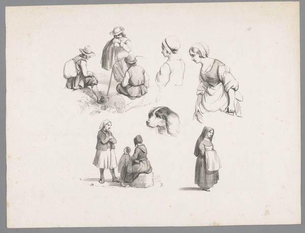 Curator: Here we have Paulus Lauters' "Six Figure Studies with, Among Others, Two Shepherds and a Rider," created sometime between 1816 and 1875. It's currently housed here at the Rijksmuseum. Editor: Well, the immediate thing that strikes me is the atmospheric sketchiness of it. The tonal range is very subtle, mostly light greys achieved with a confident pencil. Curator: Lauters’ use of pencil on paper allows us to see the traces of production. You can almost feel the artist rapidly capturing these figures. The materials themselves, so simple, speak to accessibility. These studies weren't intended for a wealthy patron. They hint at the artist’s labor, of working directly with the social classes who are shown here. Editor: Exactly! Notice how the lightness in the pencil strokes constructs these forms with minimal contrast. See the rider's hat brim and how the shadow defines its curve? These subtle variations in value create space. There’s depth hinted at that invites the eye to wander between the groups. Curator: This is typical Romantic era art; these drawings may have served as preparations for larger works which focused on everyday life. The genre-painting aspect brings in themes associated with that period. They give glimpses into lives, likely unvarnished or idealized in any significant fashion. Editor: What's fascinating is how the placement and scale of these figures within the frame generate meaning. The implied narratives become so compelling with the arrangement he selected. The seated figures along the bottom create this implied horizon. Curator: Agreed. We have the opportunity to delve into these images to find evidence of class dynamics from centuries ago! I find that incredible about his material choices; that humble drawing tools are utilized to document the beginnings of shifts of thinking during times of societal change in culture all around us. Editor: Yes, and as we've observed, Lauters is carefully calibrating each mark in terms of light and shadow. It isn't arbitrary or slapdash! I would even call his romanticism understated in terms of its tonal values; so soft and light instead of dramatic or bold which creates a delicate feeling within this drawing that speaks beautifully to a gentler age where nature had dominion over civilization. Curator: So, we begin by discussing lines on paper and quickly discover within those parameters how economic, social, plus stylistic observations add great meaning overall during Paulus Lauters time. Editor: Exactly, from pure aesthetic observation through detailed, nuanced production we’ve experienced an intricate layering about the piece’s creation.