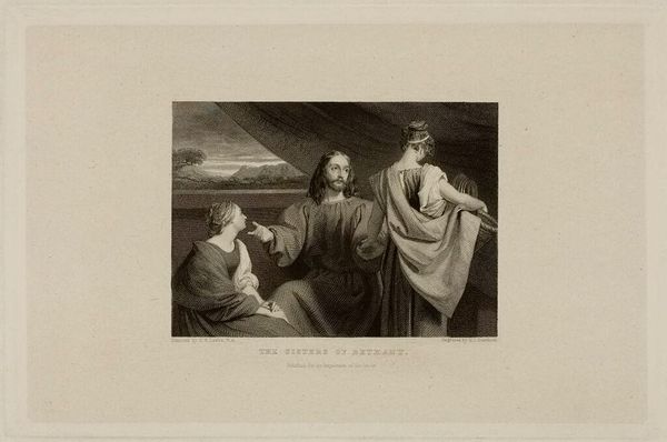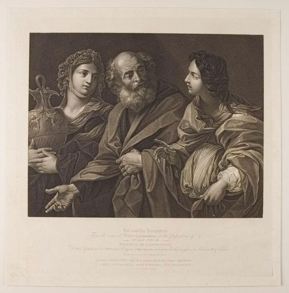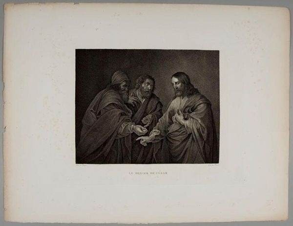 Curator: Pierre Audouin gifts us "Raphael and His Master of Arms" in this intriguing 43 by 32 cm print. Editor: It’s instantly striking how the sharp realism of the foreground figure contrasts with the almost ethereal quality of Raphael behind him. Curator: Precisely. Notice how Audouin uses the solidity and darker tones of the master of arms, to frame, almost cocoon, the lighter, more softly rendered Raphael. The composition positions them in relation to each other but also in terms of their own space. Editor: I can almost feel the master's intense focus, juxtaposed with a serene, observing quality in Raphael. It's a fascinating interplay of power and contemplation. Curator: Indeed. The artist has created a dynamic tension between the figures through contrast of light, shadow, and line, drawing us into a dialogue about influence and genius. Editor: It gives you plenty to ponder, doesn't it? A quiet image with so much going on beneath the surface.