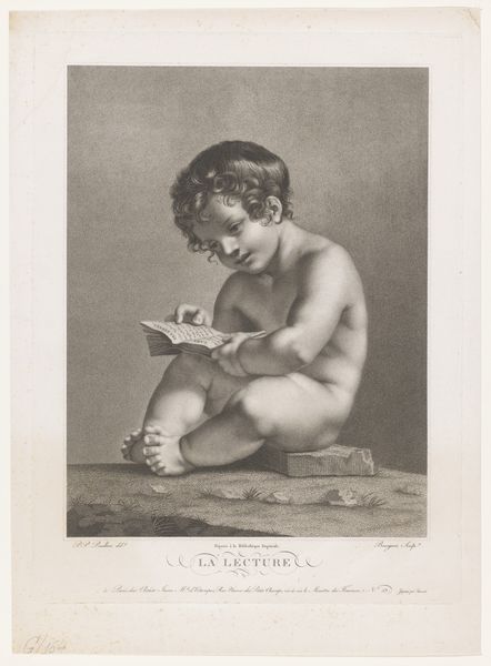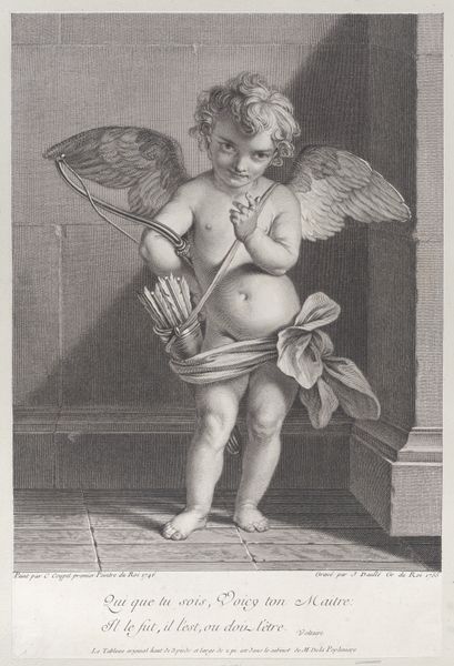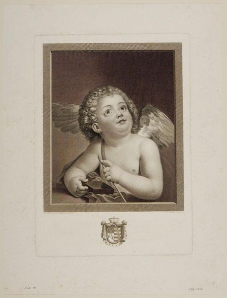 Curator: At first glance, this engraving strikes me as delicate and rather melancholic. The subtle gradations of tone give it a quiet intensity. Editor: Here we have "Cupid feeling the point of an arrow," created around 1790 by Johann Friedrich Bause. As the title indicates, it depicts Cupid himself testing the sharpness of his infamous arrow. What might not be immediately apparent is how this imagery relates to the societal obsession with love and its potent influence, particularly during the Neoclassical period. Curator: Indeed, we see Cupid embodied in a classical style, framed, almost as if caught within the confines of social expectations. I can see Bause's technique perfectly capturing Cupid’s thoughtful expression, suggesting love is not always a joyous or innocent emotion, but perhaps also laced with pain or introspection. Editor: You're absolutely right, it’s more nuanced than a simple depiction of love's joys. The texture is especially intriguing—look closely and notice the delicate lines Bause uses to define form, a style so characteristic of Neoclassical prints meant to emulate the antique. This creates a kind of visual purity but also emphasizes the emotional complexities inherent in the allegorical figure. Curator: This form contributes to the understanding and consumption of art and ideas at the time, especially among the educated elite who collected such prints. The widespread dissemination of Cupid’s image served as a potent reminder of love's power. Editor: It makes you ponder the cultural importance of visual allegory. This work acts as a symbol, encapsulating larger cultural beliefs and anxieties around love, desire, and its representation in art. Bause does it subtly through carefully rendered forms. Curator: The act of disseminating these beliefs through the act of creation makes us think more deeply about love as an active, rather than passive emotion. Editor: By understanding these artistic choices, we gain not just an appreciation for Bause’s skill but a deeper understanding of the social, political, and cultural role art plays in shaping society’s perceptions and the public imaginary.