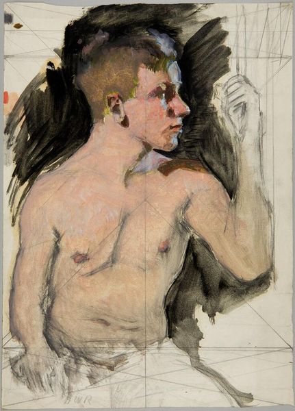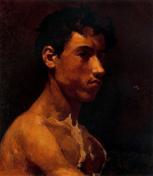 Editor: So this is Ilya Repin’s "Fireman," painted in 1887, using oil paint. I’m struck by the dramatic use of light and shadow; it feels very intense and intimate. What symbols or meanings do you see in this piece, especially given the historical context? Curator: It's quite interesting, isn’t it? Beyond the immediacy of the subject, what echoes of other traditions might we find here? Think about classical representations of the male figure, and then consider what Repin does by portraying a fireman—a hero, yes, but one of everyday life rather than mythology. Does the almost devotional chiaroscuro make it akin to a saint? Is it the new religious subject, perhaps? Editor: That's fascinating – a modern saint through his profession? I hadn't thought about it like that. The intense light definitely adds a spiritual element to an otherwise quite grounded subject. Curator: Exactly. The symbolic language is potent. How does Repin use the body itself as a carrier of meaning? What does this vulnerability, this rawness, suggest about heroism and duty? Editor: I guess the lack of idealization is important. He's not sculpted or perfect; he's just a man. The intensity feels so connected with the Russian context, though... what might be specifically "Russian" about this? Curator: Good point! Consider the late 19th century, the rise of social realism, the focus on the plight of the common person. Russia needed tangible heroes and, moreover, felt as though her "common people" are where to find the new values. This image serves almost as a visual manifesto: heroicized, not idealized, imbued with almost divine grace by the sheer virtue of occupation. Can the ordinary become transcendent? Editor: So, it's a kind of rebellion against the traditional art establishment too, then? By focusing on a real-life working man. Curator: Precisely. It asks us to redefine heroism, shifting the focus from grand historical narratives to the dignity of labor and the strength found in ordinary individuals. Editor: This has given me a new way to consider it, it is not "just" realism, it’s making a statement. Thanks! Curator: And to me it highlights how a nation identifies values to aspire towards. Intriguing work, truly.