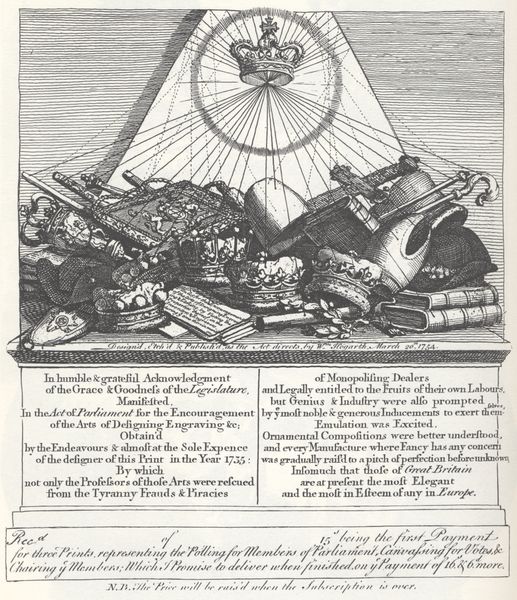 This etching, "Encouragement of Engraving," was made by William Hogarth in 1764. The print overflows with symbols of authority: a crown hovers at the apex of a radiant triangle, presiding over a jumble of royal regalia. The crown, a potent symbol of sovereignty and divine right, has its roots in ancient headdresses denoting power, such as the Pharaonic crowns of Egypt. Here, bathed in light, the crown dominates the composition, yet it rests above a chaotic pile, suggesting an inversion of order. The radiant triangle, reminiscent of religious iconography, further complicates the meaning. We see echoes of the "all-seeing eye". Consider the psychological weight of these symbols. They represent not just political power but also a deep-seated human desire for order and authority. Hogarth seems to be playing with these collective memories and subconscious associations, questioning the very foundations of power through the subversion of iconic imagery. The crown, once a symbol of unwavering authority, is now part of the disorder in the pile. It marks the cyclical nature of symbols and their meanings.