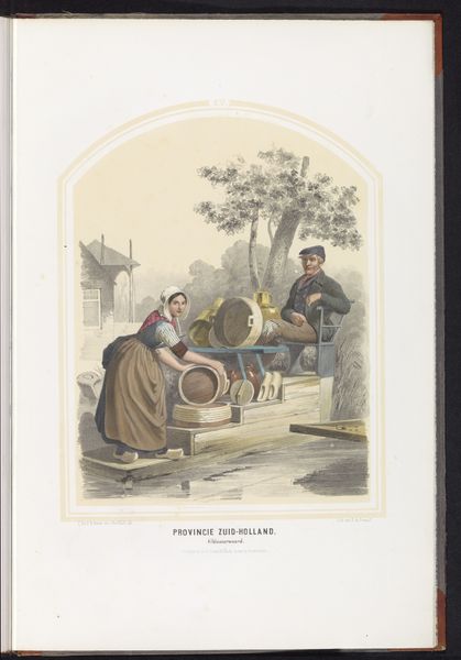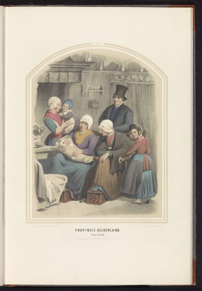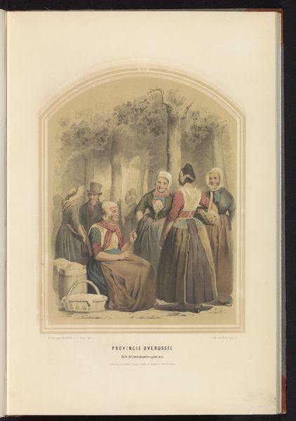 Ruurt de Vries made this color lithograph, titled "Costumes of Lonneker and Losser in Overijssel," in 1857. It depicts a slice of rural life in the Netherlands, a country undergoing significant social and economic changes at the time. De Vries presents us with women and children dressed in traditional local attire, a visual code that speaks to regional identity and perhaps a resistance to the homogenizing forces of modernization. The image appears to idealize the traditional costumes and the apparent simplicity of rural life. However, it’s important to remember the context in which this image was made and the institutional histories of the time. As the Netherlands industrialized, there was a growing interest in preserving and documenting regional customs, a trend fueled by Romantic nationalism. Images like these helped construct and reinforce a sense of national identity. To fully understand this artwork, we can consult historical archives and studies of Dutch social history from this period. This image is more than just a quaint depiction of rural life; it's a window into the complex interplay of identity, tradition, and modernization in the 19th-century Netherlands.