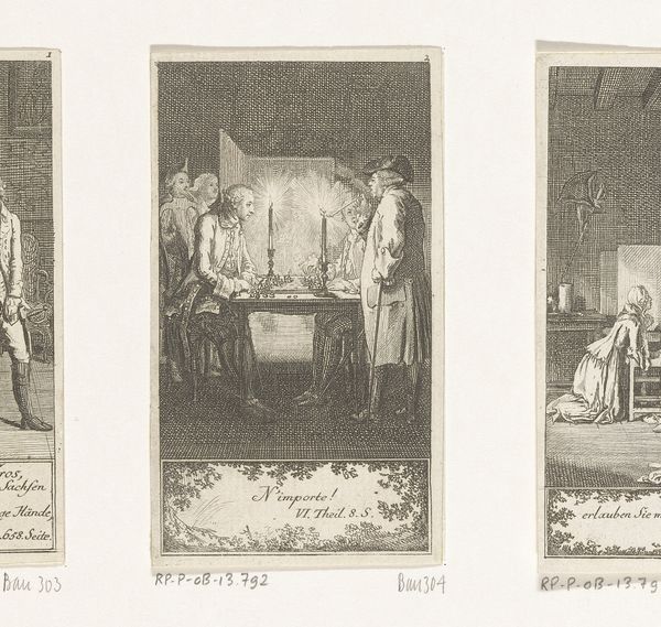 This is Daniel Nikolaus Chodowiecki’s ‘Feind speelt schaak met Herr Less,’ an etching made in the late 18th century. Chodowiecki lived through a period of immense social and political upheaval, including the partitions of Poland and the rise of Prussian power. This image captures a game of chess, but it represents much more. Chess, often seen as a metaphor for life, and for war, is being played by two men surrounded by onlookers. The setting, illuminated by candlelight, creates an atmosphere of intensity. Chodowiecki, who came from a family with Polish and Huguenot roots, uses his art to reflect on the complex social dynamics of his time. His work provides commentary on the era's changing identities and power structures. Through his precise lines, Chodowiecki invites us to consider the intricacies of human interaction and the quiet dramas that unfold within them. This print is less about a game and more about the strategies and tensions that shape our lives.