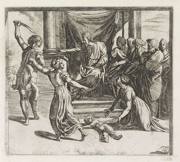 Editor: We’re looking at Daniel van den Dyck’s etching, “Susanna before the Judges,” created sometime between 1635 and 1670. It’s such a dramatic scene! All the figures are tightly packed together, creating this feeling of claustrophobia and tension, like Susanna is being closed in on. What are your initial thoughts? Curator: Claustrophobia... Yes! That's precisely the emotion I get, too! Though I also sense a bizarre dance is occurring. See how Susanna's posture suggests an unwillingness to cooperate? Baroque artists really knew how to milk every drop of pathos from biblical tales. Have you ever noticed how prevalent these “righteous maiden accused” scenarios were back then? Editor: Not really. What does that say about the cultural context? Curator: Well, aren't art and cultural context forever intertwined, dancing together through history? Think about it: religious upheavals, social anxieties about female virtue, male authority. This story – innocent woman, lecherous elders – was prime material to ignite those fiery sermons and moral debates. And in that moment, Susanna seems suspended, no one seems sympathetic, almost everyone in this piece looks ready to pounce! Is that a visual trick? Is it their poses or ours? Editor: I guess both. I see what you mean now. Susanna’s really isolated by their glares. All of the deep shadows and the linear hatching... it adds to that tension so much! I’ll definitely look closer at similar themes in other Baroque works. Thanks! Curator: Excellent, it seems you understand this vision as much as I do now.
