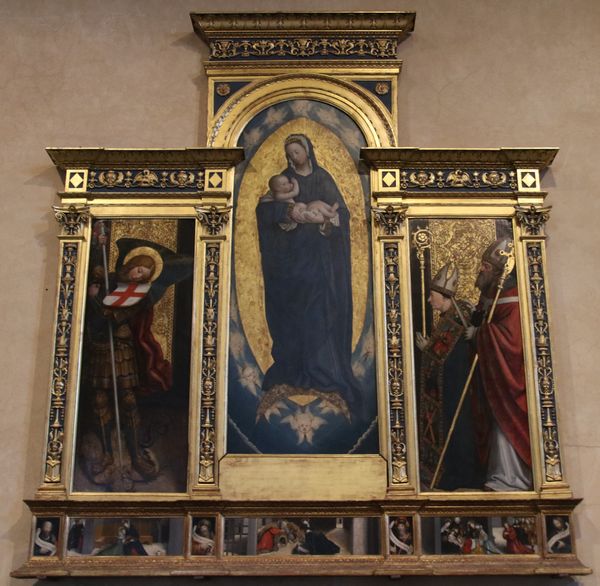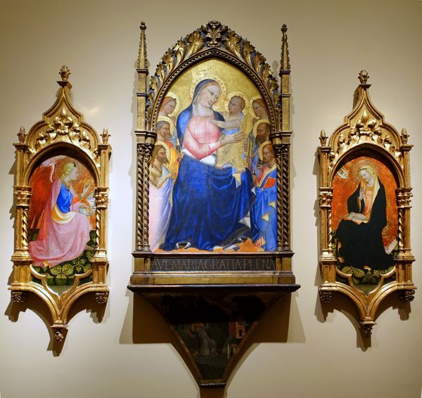 Curator: Here we have Giovanni da Milano's "Da Spedale Della Misericordia," dating back to 1370. The artwork employs watercolor. Editor: It strikes me as a radiant, almost gem-like object. The profusion of gold leaf creates such a visually rich surface. It is immediately captivating with its aura of spirituality. Curator: Absolutely. Consider the significance of gold in the 14th century. Its cost reflected immense value, obviously. But it also speaks volumes about the commissioning context for the piece, it would likely have been expensive, suggesting wealthy patrons and the intention to create an object that physically embodied their faith. The handwork involved in applying it – the very specific processes of gilding, and burnishing would have been meticulously carried out. Editor: And beyond just value, the symbolism is equally crucial. Gold, here, speaks directly to divinity, to the heavenly realm. It transforms these scenes, elevating the Madonna and Child at the centre. The ship imagery too, perhaps not immediately obvious, serves as a vehicle for souls and their journey into the afterlife, something crucial given that "misericordia" hints to a focus on piety, devotion, and care. Curator: You're drawing a fine point about symbolism here, however, the material means that enabled that symbolism should also be remembered. Looking at these hand-mixed watercolours, what are we really seeing? The natural pigments ground into mediums that needed specific climactic conditions to apply, and craft guilds passing these secret recipes, we glimpse at pre-industrial material history and the community who made art like this possible. Editor: A fascinating thought. It also highlights the inherent paradox—these material objects attempt to capture the immaterial, a timeless, and spiritual narrative using worldly elements. Even today, doesn’t this altarpiece continue to function as a mnemonic, prompting the viewer to contemplate stories of redemption and grace, just as it likely did for worshippers centuries ago? Curator: You are right. It reminds us to consider the interconnectedness between these visual expressions of belief and tangible skills, expertise and modes of living from the late 1300s, a world mediated through labour, consumption, and craft that goes way beyond just surface appearances. Editor: Exactly! Appreciating both the symbolism and material provides us with a richer understanding of this devotional piece, inviting us to remember its historical significance.