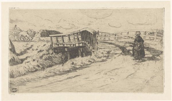 Pieter Dupont’s etching shows us a view of the Baarsjes bridge in Amsterdam. Its stark, monochrome palette invites us to reflect on the social and economic landscapes of the Netherlands. Dupont captures a moment in time, showing ordinary people going about their lives. The bridge, a connector, not only links physical spaces but also symbolizes social connections, and perhaps, divisions. The looming windmill in the background may represent progress, industry, and the changing face of the Dutch landscape. But, the subdued tones also bring an emotional weight, a feeling of nostalgia or perhaps the awareness of the relentless march of time. The artwork doesn't shy away from portraying the everyday, it subtly engages with themes of identity, place, and the silent dialogues that unfold within communities.