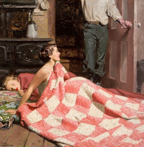 Kristian Zahrtmann completed this oil painting, Julie and the Nurse, in 1874. The application of paint is particularly important here. Notice how Zahrtmann uses visible brushstrokes to build up texture, capturing the weight and sheen of the fabrics. Consider the contrast between the nurse’s elaborate brocade dress and the simple gown of the younger woman, Julie. Zahrtmann’s focus on material detail extends to the rosary beads, the delicate fan, and the floral embellishments on the nurse's hat. These elements speak to the material culture of the time, and the social distinctions conveyed through clothing and accessories. The amount of work that went into producing the textiles on display is also important. These are not just pretty surfaces. They're products of labor, bearing witness to the hands that spun, wove, and embroidered them. By highlighting these material details, Zahrtmann invites us to consider the broader social context in which the painting was made, blurring the lines between fine art and the artistry embedded in everyday objects.