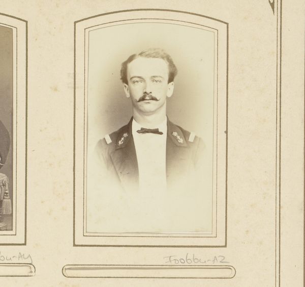 Curator: I find myself drawn to the understated elegance of this gelatin silver print by Woodbury & Page, dating back to somewhere between 1860 and 1880. It is entitled "Portret van een man met insigne op jas," or "Portrait of a Man with Insignia on a Jacket". Editor: You know, he seems awfully serious! There's this gravity, like he’s pondering a great strategic battle or maybe just wondering if he left the stove on. The soft focus adds to the air of mystery too, don’t you think? Curator: Absolutely. And his gaze is so direct. The insignia is also critical. Note how his adornments reflect codes of masculinity interwoven with ideals of duty, nationalism, and militarism that dominated 19th-century Europe. How might our understanding of photography at the time inform our reception of the portrait? Editor: The sepia tones soften things. His steely resolve becomes melancholic resignation... Almost a tinge of regret! Did you catch the romantic sway of the moustache? Curator: Precisely. Consider also the way Woodbury & Page actively engaged with Romanticism to enhance the pictorial and emotive qualities of their work. And it seems as though he has styled it in that familiar, iconic mustache of his era—it may also signal a commitment to social structures as well as perhaps defiance through fashion and personal taste. Editor: A rebel dandy perhaps! Or maybe it’s the perfect mustache for pondering profound existential questions. Either way, the craftsmanship holds up even now; he just pops right off the backdrop! You start wondering: What stories hide in this fleeting image? Curator: In conclusion, while we don't know his story specifically, understanding photography's cultural moment grants a fuller perspective for interrogating how this photograph embodies, and perhaps critiques, the societal dynamics surrounding 19th-century European manhood. Editor: Exactly! Each time I steal a glimpse at this fellow's mug, the more I realize he is a product and rejection of his era's norms! Art is a time portal for the eyes, isn’t it?
