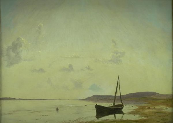 Curator: This is A. Thorenfeld’s “Parti af Jyllands Østkyst. Stille sommerdag,” painted in 1886. The canvas presents a slice of the east coast of Jutland on what appears to be a serene summer day, rendered in oil paint. Editor: Serene is the perfect word. It’s calming, almost to the point of being melancholic. The hazy sky blends into the water, and there’s this muted color palette throughout, creating a really tranquil mood. Curator: Absolutely. Thorenfeld captures that specific Northern light and feeling so well, a common pursuit for painters working en plein air during that period. The piece strikes me as carrying echoes of the Romantic ideals, especially that interest in landscape as a reflection of inner states. Editor: Right, the scale here amplifies that feeling, doesn't it? The land and sea seem to stretch on forever. I see that the Romantic style intersects with the emerging Realism—the composition leans toward capturing the scene as it is, free from the heroic narratives found in earlier landscape painting. It suggests a connection to land ownership and leisure of the rising bourgeois class. Curator: Yes, the light especially has the weight of lived reality. It is interesting how the eye is drawn to the areas where the brushstrokes are more textured. Notice the contrasts: rough textures of the beach contrasting the calm water? This highlights the materiality of place but perhaps also mirrors a certain cultural relationship to the natural landscape itself. Editor: And what about those pale, almost spectral, clouds? They’re reflected subtly in the water, adding a layer of ethereal quality that contrasts with the grounded earthiness of the shore. You feel the quietude of nature, but there’s also this undeniable sense of isolation. Considering the push for industrialization in Denmark at that time, was Thorenfeld commenting on preserving these landscapes? Curator: It's quite possible, that undercurrent of cultural tension runs throughout a lot of landscape art from this period, that desire to cling to older traditions as the world rapidly modernised. Perhaps this landscape represents the collective cultural memories associated with that simpler life. Editor: The way we can still experience it here is fascinating. A tangible moment, brought back to life for us today. Curator: It is a compelling scene that draws you into its stillness, inviting contemplation on time and our place within the vastness of nature.
