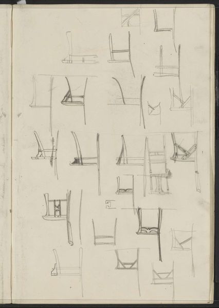 Editor: This is "Ontwerp voor een tafel," or "Design for a Table," created around 1895 by Carel Adolph Lion Cachet, currently housed at the Rijksmuseum. It's a pencil drawing, and the sketch-like quality makes me think about the relationship between geometric forms and functional design. What stands out to you from a formalist perspective? Curator: Indeed, the intrinsic compositional elements immediately capture the eye. Note the interplay between linear perspective and flattened representations of form. Observe how Cachet manipulates line weight to suggest depth and shadow, despite the overall two-dimensionality of the drawing. Editor: The overlapping shapes are intriguing, but also a little confusing. How do you make sense of the spatial relationships he's created here? Curator: Precisely. This is where the beauty lies. By refusing to adhere to a single, coherent perspective, Cachet emphasizes the conceptual nature of design. Each element exists not as a definitive representation of a physical object, but as a collection of lines, angles, and planes—building blocks of a potential form. The pencil medium further reinforces this notion, imbuing the design with a sense of ephemerality and possibility. Consider, also, the art nouveau influences that lead to the subversion of purely geometric form with natural motifs in an implied context. Editor: So, rather than seeing a flawed perspective, we should appreciate how the overlapping lines invite us to actively participate in envisioning the final object? Curator: Precisely. This invites a deeper engagement with the fundamental language of form itself. The absence of color directs attention solely to line, shape, and composition—the bare essentials of visual communication. The drawing becomes a semiotic exercise, a map of potential rather than a fixed reality. Editor: That's a helpful perspective! I was initially focused on trying to understand the "real" table being depicted, but now I appreciate it as an exploration of pure form. Thanks for your insight. Curator: My pleasure. Focusing on these inherent qualities allows us to appreciate its structural beauty, beyond mere function or historical relevance.