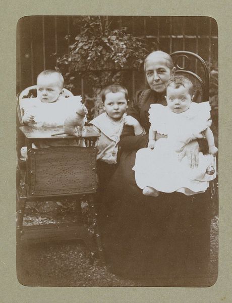 Editor: This photograph, “Vrouw met twee peuters bij een bank, waarschijnlijk de tweeling Ad en Johanna van der Kop en een familielid” by Willem Carel van der Kop, was taken sometime after 1901. It features a woman sitting on a bench with two young children, all dressed in formal clothing. There's a quiet stillness to it, a posed moment trying to capture everyday life. What can you tell me about it? Curator: This photograph really speaks to the changing role of photography in the early 20th century. Before this time, photography was primarily used for portraiture within a studio. However, photography began to capture everyday life of people and families, albeit a somewhat formal snapshot in this case. Editor: A formal snapshot? Curator: Yes, it seems to depict a middle-class family deliberately posing for the camera. But look closely: what's not visible is equally interesting. The setting, though outdoors, is carefully controlled, and there’s a distinct effort to portray an image of respectability and stability. These details invite questions. Who was this family? And how might their social standing influence their desire to be documented this way? Editor: That’s interesting. I didn’t consider the social implications of taking a photo at the time. The photo seems like a simple family picture, but I now see that it's documenting a specific cultural image that the family wants to project. Curator: Exactly. It highlights how photography quickly became a tool for constructing and reinforcing social identities and the family unit. What do you take away from our conversation? Editor: It reminds me that art is rarely just art. This piece makes me curious about how art plays a bigger role in our society and politics than I thought. Curator: Me too, which makes this photo especially intriguing. I want to research more.