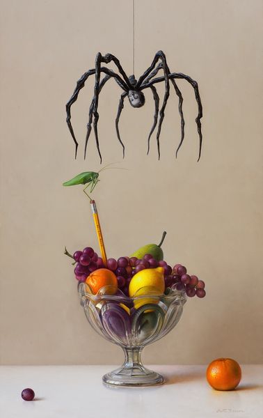 Scott Fraser painted this artwork titled 'Pineapple Imposter'. The painting presents a playful combination of a watermelon and pineapple, creating a novel form that defies natural expectations. Fraser composes the painting in a way that draws attention to the artifice of representation. The still-life structure of the artwork invites us to consider how we interpret objects based on their superficial qualities. The title itself, "Pineapple Imposter", prompts a semiotic reading: the artwork challenges our preconceptions, causing us to question the nature of identity and authenticity. The artist exposes the underlying structures of how we perceive and categorize the world around us. Ultimately, it is a game of visual deception, where Fraser cleverly subverts our expectations.