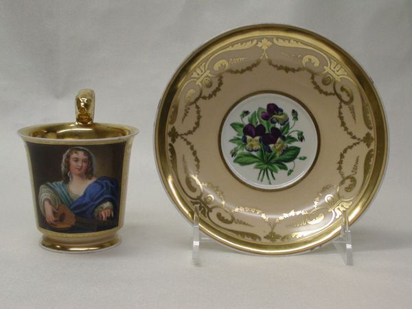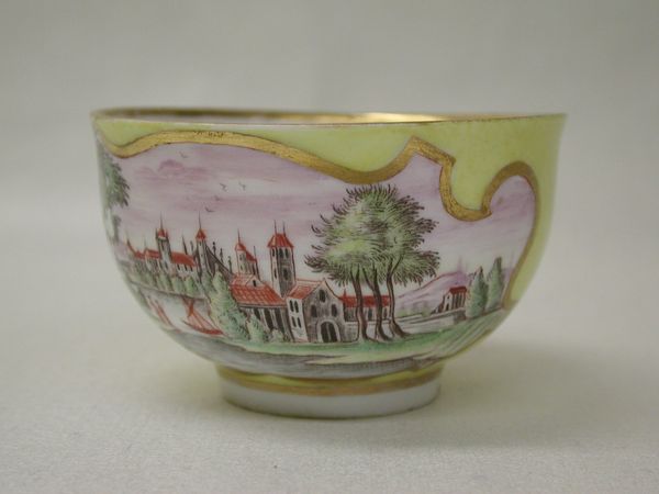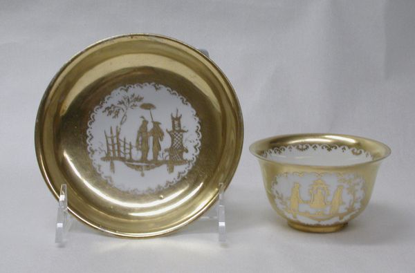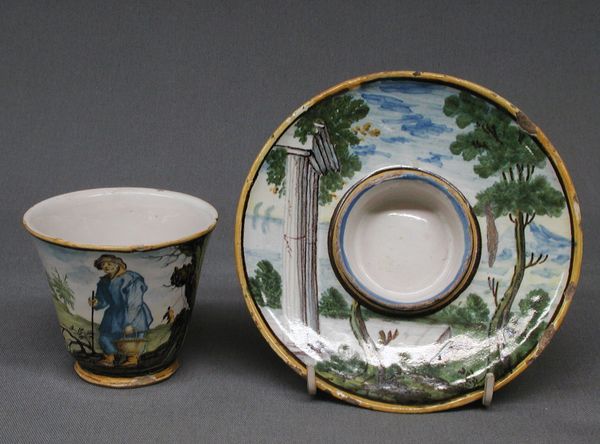 This porcelain cup and saucer was produced at the Nymphenburg Porcelain Manufactory in Germany, which began production in 1747. This gilded service exists at the intersection of luxury and the pastoral. On the saucer, we see a woman, perhaps a milkmaid, drawing water from a well, a child at her side, sheep at her feet. In the 18th century, the evocation of pastoral life was a popular motif, though the reality of peasant life was far from the romanticized version depicted here. The whiteness of the porcelain, the gilding on both pieces, and the subject matter depicted on the saucer all speak to the tastes and desires of the wealthy. The cup and saucer suggest a life of leisure and privilege, steeped in both the aesthetic and the social conventions of its time.