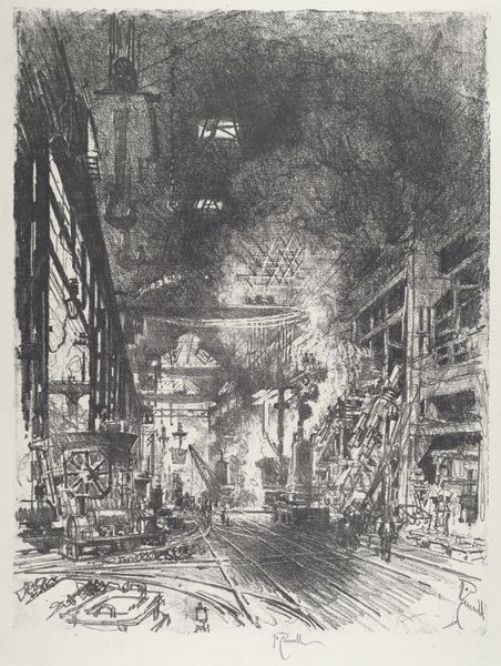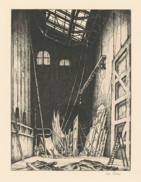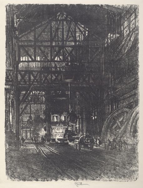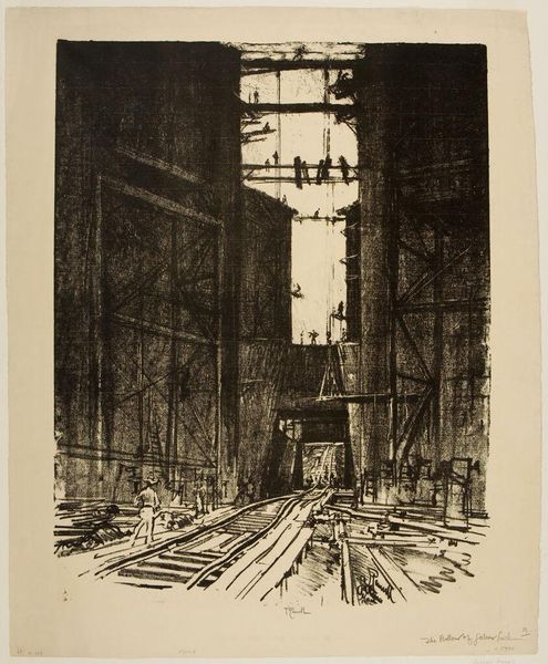 Joseph Pennell’s “At the Bottom of Gatun Lock” is a work that transports us to the Panama Canal during its construction, a time when engineering ambition met human endeavor. Pennell was deeply interested in the monumental scale of industrial projects. Here, the Gatun Lock, a critical part of the canal's infrastructure, is depicted with its immense scale and the tiny figures of the workers, mainly of Afro-Caribbean descent, who were essential to the canal's construction. The print subtly raises questions about labor, race, and the human cost of progress. The stark contrast between the heavy shadows and the bright sky emphasizes the depth and scale of the lock, and the emotional impact of this juxtaposition leaves us with a sense of awe and solemnity. Pennell invites us to reflect on the complex legacy of the Panama Canal, a marvel of engineering built on the backs of countless laborers.