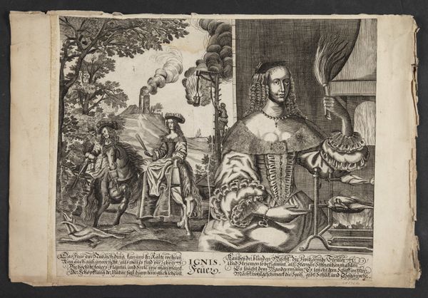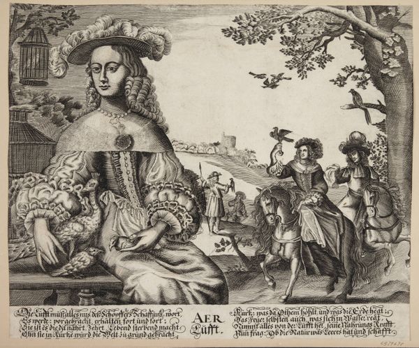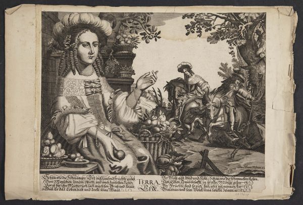 Curator: Welcome. We are standing before "Autumn (Autumnus - Bacchos)," an engraving dating back to sometime between 1639 and 1684. It's currently held at the Statens Museum for Kunst. Editor: My immediate impression is one of divided realities. The formal, almost portrait-like figures contrast strongly with the genre scene happening in the background. Curator: Indeed. It is categorized as both genre-painting and landscape and contains allegorical elements. Look at how the print medium allowed the engraver to render minute detail and intricate patterns on the figures' garments. We can explore how printmaking enabled dissemination of these allegorical representations to a wider audience. Editor: Absolutely. Notice the tonal gradations, which contribute to a sense of depth, directing our eyes into the landscape beyond. The composition places us, the viewers, into the role of participant and observer simultaneously. Curator: This engraving, crafted by Heylricus Allert, demonstrates how autumn and the figure of Bacchus, Roman god of wine, could be leveraged for didactic messaging and genre depictions in the artistic milieu of the period. It also illuminates themes related to labor, the production of goods, and social relationships linked with harvests, which reflect certain socio-historical perspectives. Editor: I find the use of iconography incredibly engaging. We have astrological symbols and what appear to be short verses—likely Dutch—inscribed at the bottom. These elements, together, produce an aesthetic tapestry. Curator: Right, and consider the influence of these prints; consider how readily images and ideologies would spread and the impact this had on contemporary viewers' lives. Editor: Looking closely reveals the artistry embedded within even these mass-produced images, reminding us of art’s multifaceted capabilities and functions. Curator: Absolutely, it's been interesting looking into the ways the medium intersects with class, labor, and cultural expression in a piece such as this one. Editor: Agreed. I found analyzing the use of contrasting spatial arrangement to reveal complexity equally enriching.
