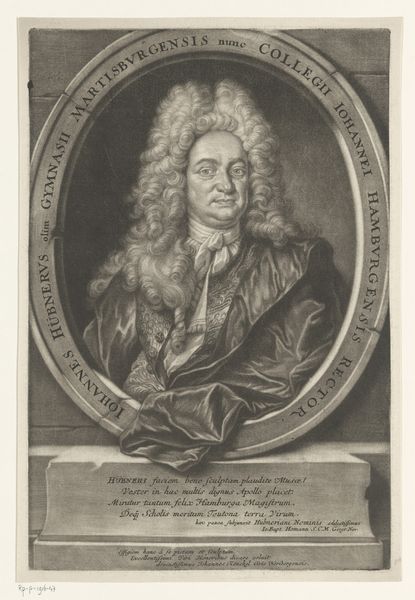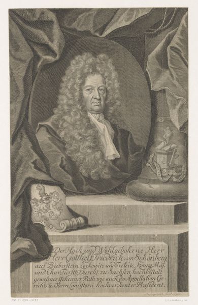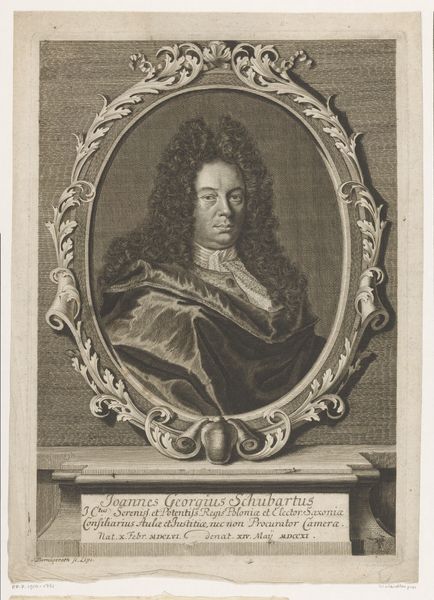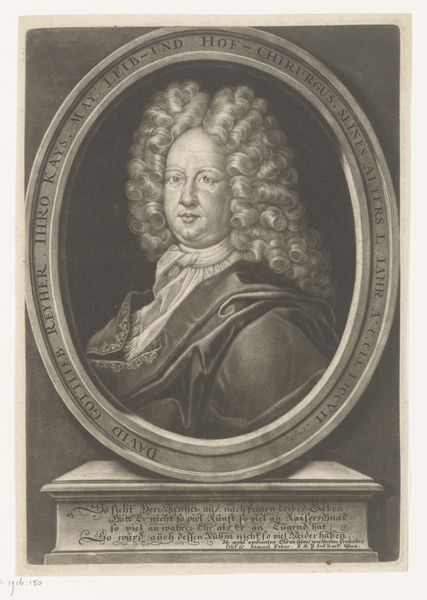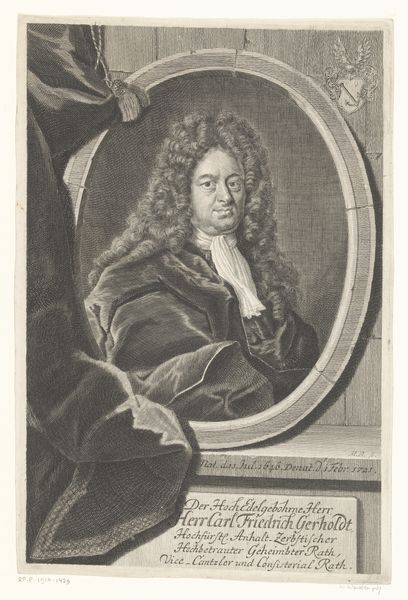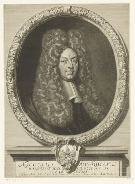 Curator: Here we have Martin Bernigeroth's "Portret van Arnold Wesenfeld", crafted in 1707. It’s an engraving, currently held at the Rijksmuseum. Editor: Well, isn’t that just a glorious wig? It’s almost swallowing him whole. Seriously, it's the first thing that grabs you. I feel like he might wink, like a grumpy celestial from some long-lost chapter in folklore. Curator: The wig, and the elaborate lace jabot, are very much symbols of status and intellectual prowess of the Baroque period. The engraving captures not just Wesenfeld’s likeness, but also his societal role. He was a professor of moral philosophy. It mirrors back on what we associate with philosophers. Editor: That inscription underneath does sound weighty. He looks… well, a bit burdened, honestly, maybe overwhelmed by the very rationality he professed! Is that me reading too much into a squiggle of ink? Or, in this case, meticulously etched lines? Curator: Not at all. Consider the oval frame itself, adorned with ribbons. Oval portraits, particularly during that period, served as emblems of importance and achievement. Framing contains the subject and the gaze of the viewer. It also makes him timeless and permanent. Editor: It gives it the quality of a slightly haunting cameo—like it could come alive any moment and mutter about the crushing weight of philosophical responsibility. I mean, that's some heavy stuff to engrave. I find myself wondering about his students, like what their questions were. Curator: Engravings like this were often commissioned as ways to disseminate knowledge and images of prominent figures. It’s a form of early social media, sharing Wesenfeld’s image beyond his immediate circle. The lines are so carefully wrought that the texture comes alive with minute hatching marks in shadow areas to suggest volume, depth. This meticulous method creates an enduring record, almost as if meant to carry wisdom to new centuries. Editor: It succeeds, wonderfully. His gaze, the meticulous linework, the formal composition, all build toward a strong symbolic impression. Like he holds some precious and old story about reason. Even with that wild hair. I never considered rationality could look like that. Curator: Indeed. It makes one ponder on representation and how individuals consciously shaped and shared their identity during the 17th and 18th centuries. Editor: For me it prompts thinking about wisdom across time. I look at Wesenfeld, rational mind as I am certain he had, captured on something so meticulous. It prompts me to think, maybe we aren’t as far from that time as we imagine ourselves to be.