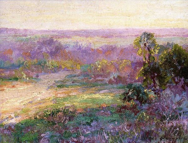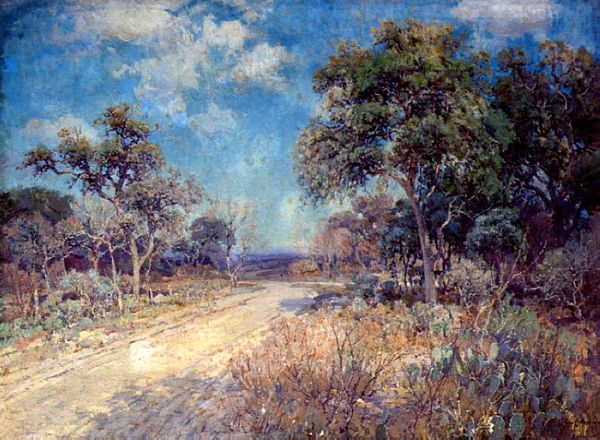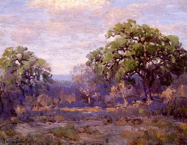 Editor: We're looking at Robert Julian Onderdonk's painting, "A Path Through the Texas Hill Country," rendered in oil paint with an impressionistic style. It’s incredibly evocative; you can almost feel the heat radiating off that dusty path. What stands out to you about it? Curator: I see a specific mode of production and a representation of labor embedded in this landscape. Consider the materiality: oil paint, applied *en plein air*, suggests a direct engagement with the land. How does Onderdonk, through his technique, participate in shaping the *idea* of Texas? Editor: That's fascinating! So, you’re saying it's not just about the beauty of the scene, but how Onderdonk’s interaction with the materials and location reflects a larger cultural narrative? Curator: Precisely. This "Regionalism" movement painting speaks to labor. Whose labor is unseen here? The brushstrokes might evoke leisure, but what about the broader social context of land ownership, resource extraction, and the economic structures that made this picturesque scene possible? Consider the implications. Editor: I never thought of it that way, it gives a new layer of appreciation for the painting and its relation to society back then. Curator: It asks us to question not just what we see, but *how* and *why* we see it. Think about the artist's materials: oil, canvas – how were these obtained and produced? Considering those questions deepens the narrative. Editor: It really challenges that traditional boundary between enjoying the aesthetic and examining the deeper socio-economic elements present. I will have to look more carefully from now on, with all this context in mind. Thanks. Curator: Absolutely, the Texas Hill Country is so much more.