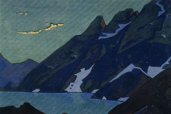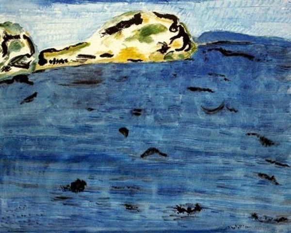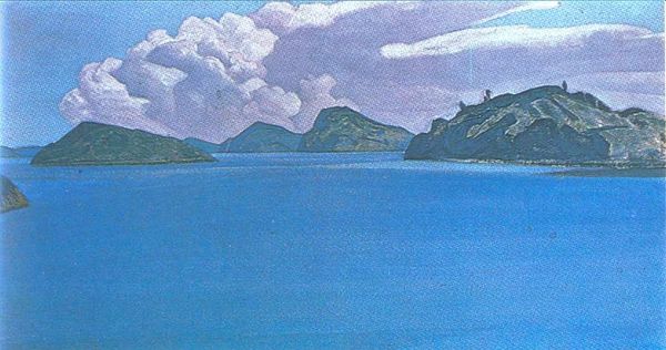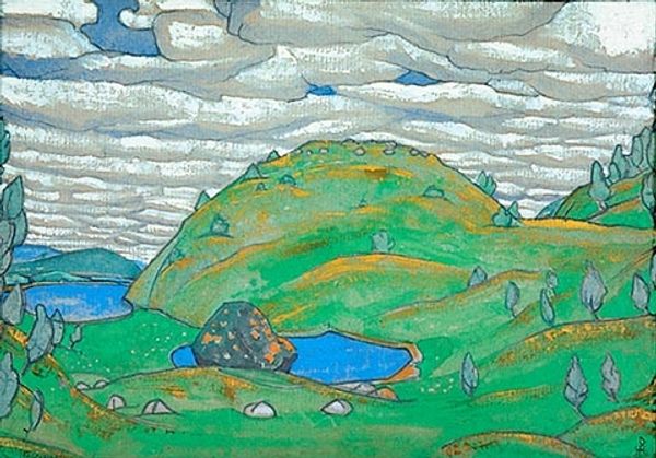 Curator: What strikes you first about this work, I mean, at first sight? Editor: It’s so...serene, almost otherworldly. That dreamy blue dominates everything, doesn’t it? It's like gazing into a forgotten, peaceful dream. Curator: Indeed. This oil painting is entitled “Karelian Landscape. Rocky Seashore.” painted in 1917 by Nicholas Roerich, reflects the artistic inclinations towards landscapes prevalent at the time. Editor: Oh, Roerich! That man had such a profound connection with nature and landscape, particularly with mountains and mystical nature. Curator: Absolutely, you know, his involvement in the cultural and spiritual movements greatly shaped his perception of the natural world and influenced his paintings? The flattened perspective gives the sea and sky a sort of unified feel, I think. Editor: You're so right. It's fascinating how Roerich simplifies the landscape into these basic geometric forms. It’s an expressionist take, definitely playing with simplification and emphasizing this serene, almost detached quality. He pulls away any sentimentality to allow for more reflection on the overall impression. The brushwork itself is very calming too, simple, solid colors defining objects more so than intricate brushstrokes. Curator: I feel like with this composition, he is not so much portraying a location but rather he's portraying the *idea* of a wild, untouched region, shaped by its unique geographic conditions and the experiences they inspired. It's no surprise, he was keen to illustrate settings for fairytales. Editor: Yes, exactly. I am still fascinated by this ethereal, peaceful nature the artist so vividly conveyed through just oil on canvas! There is something beautifully simple and timeless to that which makes the viewer truly absorb all that the scenery can evoke in us. Curator: So well said. It's this very quality, isn’t it, that makes Roerich such an enduring, if somewhat underrated, master of landscape art. Editor: Absolutely! It allows each viewer to experience the landscape's profound stillness and quiet mystery, time after time.