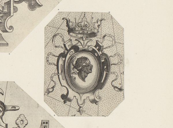 This small graphic, “Halve ovale cartouche met rolwerk,” presents an intriguing study in form and symbolism, meticulously rendered by an anonymous hand. The black lines against the off-white paper create a symmetrical composition, anchored by an oval cartouche displaying spherical shapes, crowned with what appears to be royal adornments and flanked by foliage. The artist's emphasis on linearity invites us to consider the visual language of heraldry, and how it communicates status. The symmetrical arrangement of the design elements around the central oval suggests a codified visual system, typical of emblems. The detailed crown speaks to notions of power. The foliage, rendered with fine lines, presents a contrast to the geometric exactness of the spheres, enriching the piece's visual complexity. The very act of depicting a cartouche, traditionally a blank space for inscription, yet here filled with symbolic forms, challenges its conventional purpose. Is it a declaration of established identity, or a semiotic experiment? As we consider these elements, we see that this small graphic does not simply present an image; it poses questions about the structures that uphold meaning.