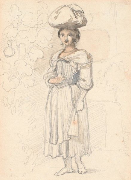 Curator: This is Federico Zuccaro's "Standing Woman Wearing a Hat," currently held at the Harvard Art Museums. It’s undated. Editor: It's delicately rendered; almost dreamlike. I wonder what sort of paper and graphite Zuccaro used to obtain such translucence. Curator: Consider the hat, adorned with flowers. It's not merely decorative; it might symbolize fertility, a connection to nature, or perhaps even social standing within her community. Editor: Yes, but also look at the economy of line. The hatching suggests rapid execution, maybe a study for a larger composition, and how much would those materials have cost him? Curator: I see the slight upward gaze as suggesting aspiration, perhaps even a spiritual yearning. Editor: I'm more intrigued by the quick, assured marks creating the form. It’s a glimpse into the working methods of an artist during that period. Curator: Ultimately, it's a compelling image with layers of meaning, even if the meaning may now be lost. Editor: Absolutely, it’s an interesting window into the artist's practice, as well as materials available at the time.