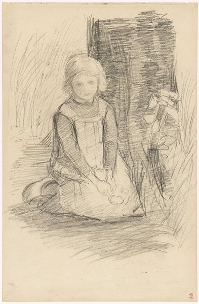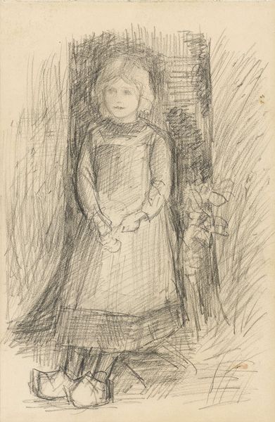 Editor: Here we have Otto Scholderer’s “Little Girl Feeding a Doll,” created around 1880, a drawing with pencil and chalk on paper currently residing in the Städel Museum. The intimacy of the scene strikes me. What unspoken stories do you think this image hints at? Curator: It's fascinating how this seemingly simple image vibrates with a layered symbolism. Consider the doll itself: more than a toy, it represents a surrogate, an object onto which the girl projects her own needs and experiences. Doesn’t it suggest early lessons in nurturing? Editor: It definitely hints at the performative aspect of childhood, imitating adulthood. Does the bowl suggest anything specific to you? Curator: Indeed. The bowl, alongside the gesture of feeding, reinforces this idea of 'mothering'. In genre paintings of the period, food preparation and caregiving were common symbols representing domestic virtue. Do you think this connects to any social values of the time? Editor: Maybe! I imagine there were rigid expectations for women in domestic life during this era, and this might mirror or reinforce that expectation. I didn't initially make that connection so clearly. Curator: Precisely! Notice also how Scholderer renders the girl’s gaze directed downward. What emotional register does that visual choice evoke in you? Editor: It lends her a pensive quality, as though she is completely absorbed in her own private world. There’s a sense of quiet reflection. Curator: Which highlights the potent symbolism within such a humble setting. The power of imagery, even in the most understated composition! Editor: Definitely makes me see beyond the initial appearance. So much depth conveyed with so few lines.