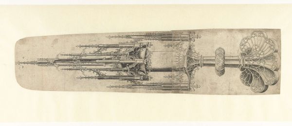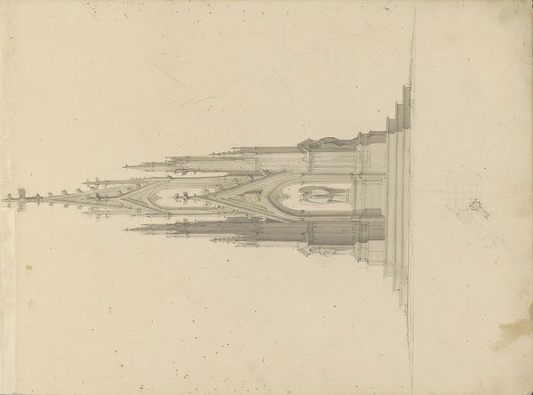 Here is a drawing of the Schöner Brunnen in Nuremberg by Pierre Joseph Hubert Cuypers. Executed in pencil and brush in grey ink, the artwork captures the ornate gothic fountain behind a fence, observed by groups of figures. Cuypers masterfully employs linear perspective to emphasize the fountain's height and intricate details, creating a sense of depth and scale. The subtle gradations of grey wash enhance the texture and sculptural qualities of the fountain, drawing the eye upward. The fence in the foreground acts as a framing device, inviting viewers to observe the scene from a distance. The meticulous rendering of architectural elements reflects the 19th-century fascination with historical preservation and documentation. This piece not only serves as a record of a specific monument but also engages with broader themes of cultural heritage and visual representation. The composition invites a meditation on how we perceive and interact with historical spaces.