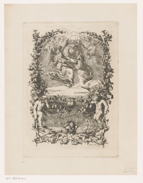 Curator: Right, so we are looking at a mixed-media print, combining etching and engraving, by Nicolas Ponce. It's titled "Allegorical Portraits of Philip II and Charles V" and was produced sometime between 1790 and 1816. Editor: It's striking. It gives me this odd sense of propaganda, but… muted. Like whispers from a history book rather than a shout. Is that intentional? Curator: Absolutely! Prints like this often served a dual purpose: commemoration and, yes, a subtle form of influence. Note how each monarch is framed within these almost theatrical vignettes teeming with symbolic details. Consider the historical moment too. Editor: I notice the figures around them and the symbols... There are flags, defeated enemies it seems, almost like trophies? The whole scene looks like an altar, the two portraits icons on each. And it's a study in contrasts – Charles V seems regal, almost serene, while Phillip II has a more stern expression. Why juxtapose them this way? Curator: The iconography sets them up as different kinds of rulers, both drawing from unique strengths of power, and contributing to the collective 'greatness' of French royalty under the title "Les Illustres Francais". Think of it as Ponce’s exploration into an era’s complicated power structures using portraiture. It almost deifies them! Editor: I can dig that. And is that text below integral to the piece? Or something separate? Curator: Integral. That script is essential to understand how Ponce directs the viewers into perceiving royalty through written, political context. I mean, imagine encountering this in its time – seeing the artistry combined with explicit justifications right there. You are forced to connect the ruler, his accomplishments and all surrounding ideas into this perfect idol. Powerful. Editor: It makes you wonder about the intended audience and what narratives they were internalizing about power. Overall, Ponce is subtly asking people to remember and believe specific aspects of these rulers, carefully building an ideological bridge between generations using allegorical portraiture. Clever! Curator: Precisely. And isn’t it interesting to consider the echoes of these choices reverberating through time.