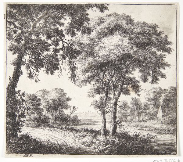 Editor: We’re looking at "Rustic Bridge in a Tangled Wood," an etching by Carl Wilhelm Kolbe. It's undated but the museum holds it. The textures in this print, all created through etching on paper, really pull me in. What’s your read on this, particularly the relationship between nature and humanity depicted here? Curator: Ah, yes. I feel immediately drawn into this small pocket of existence, so meticulously crafted by Kolbe. It is quite Romantic, isn't it? Note how the wildness of nature, that near chaotic tangle of branches and undergrowth, sort of dwarfs the figure on the bridge. This speaks volumes to me about humanity’s place in the world – present, certainly, but undeniably part of a larger, more powerful system. A system we perhaps don’t fully understand. Does the lone figure inspire contemplation, or perhaps a bit of loneliness in you? Editor: I get a little bit of both, actually! He looks like he's really got a heavy load, and the trees almost seem to be leaning in towards him, curious. It’s intriguing that this is a print – that must have taken a long time. Does this level of detail lend anything more to it, in your opinion? Curator: It’s more than detail, it’s…presence. Kolbe, through that incredibly meticulous technique, wasn't just rendering a scene, but really inviting the viewer *into* that space. Into a reflective mood, if I may add. Notice how the trees aren’t just backdrops but active participants. We see them as individuals, as characters in this miniature drama. What's that do for you? Editor: It makes the natural world feel almost animated, less like a scene and more like a living environment with that one individual merely passing through. Like time stopped in an imaginary enchanted forest from a fairytale... I’ve definitely gained a deeper appreciation for his technique by observing that. Curator: Absolutely. It's about seeing beyond the surface and truly *feeling* the interconnectedness. I, for one, feel grounded when contemplating pieces like this. A welcome reminder, I’d say.