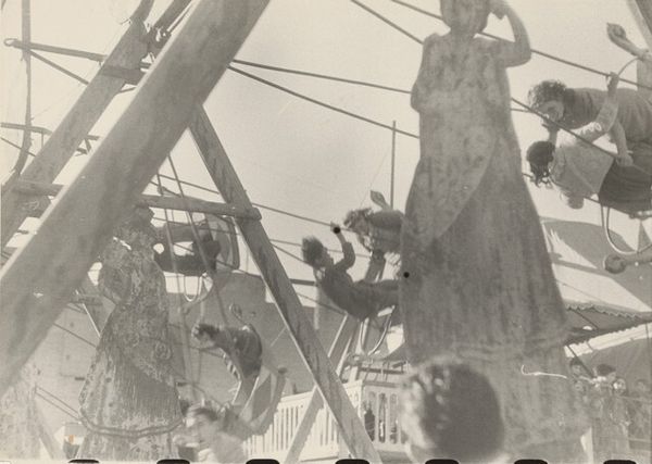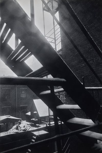Curator: I find Nathan Lerner’s gelatin-silver print, “City Light Box Study,” made in 1943, to be unexpectedly hopeful, don't you think? Editor: It feels rather somber at first glance—all those grays! It makes me imagine endless days of laundry. Curator: Right, and thinking about it, Lerner was deeply involved with the New Bauhaus. He brought that interest in form and structure to his commercial photography. In this cityscape, it’s intriguing how ordinary clotheslines become architectural lines. Editor: Exactly. The way the laundry dances on the lines is just so lyrical and evocative. Like transient sculptures set against the rather grim, sturdy permanence of brick. Do you suppose he saw the beauty in everyday routines or was commenting on it? Curator: Probably both. The sharp contrast emphasizes the texture of everything—stone, fabric, the metal bars. These stark contrasts elevate what we might see as a purely utilitarian scene into high art. Lerner’s manipulation of the medium transformed something so commonplace into something enduring. The work elevates daily acts into a visually interesting art. Editor: It really does, and while doing that, it freezes a specific, difficult time when clean laundry was a real victory! All that starch and struggle implied within that dangling wash—the work and resources it must have cost! Curator: Thinking about the broader implications of the black-and-white format, you can almost smell the lye soap and imagine the labor involved in maintaining these cloths in this condition. Editor: Which, I imagine, during the War years, meant sacrifice in maintaining dignity. It reframes domestic labor as work but also possibly resistance? And yet, looking at it, my most vivid impression is the quiet stillness amidst what would surely have been a time of anxiety. Curator: Ultimately, Lerner prompts us to reassess beauty in the quotidian, pushing us to really see the details of everyday life. Editor: Absolutely. This image resonates in surprising ways, hinting at tales within what appears, initially, to be simply gray shades on hanging fabric.