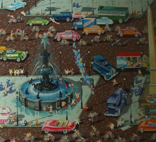 Here we see ‘Four Cities Suite, Los Angeles’ by Hiro Yamagata, the Japanese-born artist known for his laser and hologram artworks. Yamagata presents us with a playful, yet pointed, take on the city of Los Angeles. He spotlights the city’s cultural identity through its entertainment industry. Billboards of Marilyn Monroe, Jaws, and Casablanca create a backdrop for the Hollywood dream. The artist focuses on its cinematic history, but what about the lives behind the camera and beyond the screen? Yamagata includes the Playboy Club, Hollywood Animal House and Little Caesar’s as part of the cultural landscape. We need to ask, who is invited to partake in the Los Angeles dream, and who is excluded? What is the cost of admission, so to speak? With this work, Yamagata asks us to consider the allure and the exclusions of Hollywood and its impact on the cultural landscape. The artwork subtly suggests that fame and fortune are often built on the labor and exclusion of many.