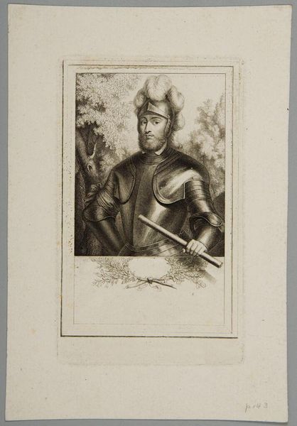 Curator: Look at this portrait! The sharp graphite lines forming Dirk IV, Count of Holland. Made around 1650 by Cornelis Visscher, it resides here at the Rijksmuseum. It really leaps out. Editor: Yes, the materiality is remarkable. Look at the quality of the print. You can see the dense layers and variations in tone, evidence of the artist’s labor with graphite and engraving to produce something of such intricacy. There's something quite stunning in its almost photorealistic quality. Curator: Absolutely! Consider that Dirk IV died in 1049. So Visscher created this image over six centuries later, contributing to the already-loaded symbolism of Dutch identity and statehood. He isn't merely depicting a man; he's reinforcing a constructed lineage and solidifying historical narrative during a time of intense political development within the Netherlands. Editor: And thinking about it materially, what were the circumstances that determined this need for such visual reinforcement? The consumption of prints such as these must have been shaped by the material conditions and needs of that era. Perhaps cheaper and faster to reproduce compared to a painting on canvas? It could be the choice of accessibility and a reach toward broader audiences beyond elite spheres. Curator: That’s right. The very creation and circulation of such portraits serve as an act of enshrining specific individuals and a larger idea. It highlights the dynamics of power, particularly relevant given Holland’s evolving role. Editor: And we shouldn’t dismiss how the craft aspect speaks volumes. There is no singular piece, no virtuoso brushstroke; it is an etching and engraving – something born from labor and replication. Each stage impacts and expands meaning. The physical marks left, the transfer of the image itself and its multiple uses all speak to a broader meaning, in my eyes. Curator: Yes. Beyond just seeing an image of power, we also feel how power manufactures meaning across centuries. By understanding the portrait not as a singular representation, but rather as one drop within an ocean of portrayals. We start realizing the deeper politics at play. Editor: This reframes how we see historical representation. Considering art-making as social action and a chain of events allows new insights into consumption. Curator: Exactly, each one brings forth questions regarding the circulation of ideals and societal constructions. Editor: Right. When you think about all that handcraft. Extraordinary. Curator: It definitely brings new perspective.
