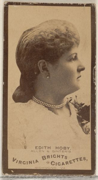 This card, created by Allen & Ginter for Virginia Brights Cigarettes, is from a series featuring actors and actresses. It's a small, mass-produced object, made using photographic and printing techniques. The card's material presence speaks to the world of advertising and consumer culture, reflecting the rise of mass media in the late 19th century. Photography allowed for widespread reproduction and distribution. These cards were included in cigarette packs as a marketing tactic. Though seemingly inconsequential, this was a skilled trade. The card would have been designed, photographed, printed, and die-cut in factories. The image’s sepia tones give it an antique feel today, yet its original purpose was entirely commercial. The very fact that someone’s portrait could be captured and multiplied was still relatively novel. What seems like a simple commercial product, in reality, involved many hands and complex industrial processes. It challenges our notions of what constitutes art, design, and labor.