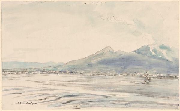 Editor: So this is Muirhead Bone’s “Arbetello in the Maremma,” a landscape executed in ink and watercolor. The muted palette gives it a melancholic feel, almost like a faded memory. What story do you see within these washes of grey and blue? Curator: I see a commentary on land and labor. The Maremma, historically a marshland, speaks to centuries of human intervention. Consider the politics embedded in its reclamation—whose labor shaped this landscape, and for whose benefit? Editor: That's a perspective I hadn't considered. I was focused on the aesthetic qualities, the way the light seems to diffuse across the water. Curator: But light itself can be a tool. How does its depiction here either reveal or obscure the social realities of the Maremma? Think about visibility, access, who gets to see and control this space. Are we looking at a romantic vision or something more critical? Editor: I think it’s somewhere in between? The buildings in the distance suggests people lived there and it wasn’t a purely natural scene, so he probably wasn't romanticizing. Curator: Exactly, it’s about disrupting the concept of an untouched landscape and inviting reflection on how our interventions have formed this place. This piece acts as a starting point to ask what kind of dialogue that might involve today, regarding access, labour, and land. Editor: That makes me think about climate change, too, and the human impact on vulnerable environments. Thanks, that was fascinating! Curator: Indeed. Art allows us to reimagine how we relate to place, people, and planet. It is not about passive observation, but sparking new dialogues on pressing issues.