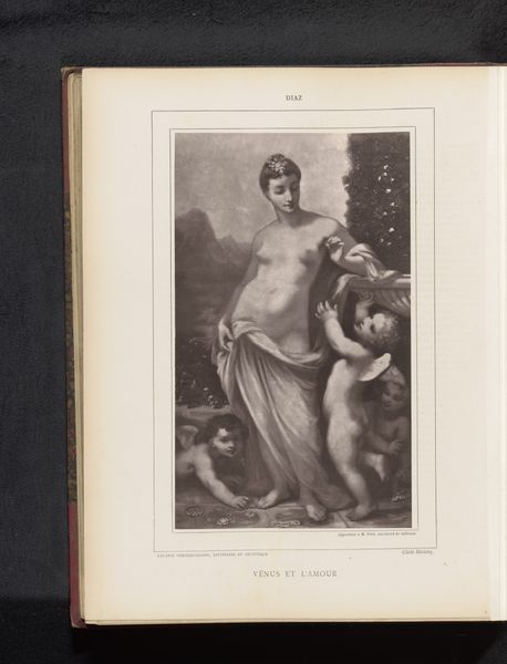 Curator: This photograph captures a reproduction of Henri Regnault’s famous painting, Salome, sometime before 1876. Let’s explore its details and broader implications. What's your initial response to it? Editor: The textures are incredibly striking, even in this monochromatic form. The lace of her dress, the fur on the floor – there’s a decadent, almost tactile quality to the whole image. But there's also something unsettling in the play of light and shadow. Curator: Indeed. Salome was a very popular and controversial figure in late 19th-century art and literature. The original painting certainly courted controversy for its sensual depiction of a biblical character. She represented dangerous female power and challenged conventional moral codes. Do you see that conveyed in this photograph? Editor: I notice how the artist focuses on the visual elements to underscore meaning. Her gaze, averted slightly, creates a tension – is it indifference or knowing complicity? Also consider the placement of John the Baptist's head in that bowl... it’s presented almost casually. It makes you question her internal state as a reader. Curator: Exactly! Regnault’s painting and reproductions like this became powerful vehicles for anxieties about women, class, and power at a time of considerable social upheaval in Europe. Artists were very interested in portraying these biblical or mythical figures. Editor: From a formal perspective, it’s a brilliant example of the Romantic obsession with dramatic contrasts and the use of color to enhance emotions. It's about more than a simple narrative of lust and retribution, I feel. It delves into themes of power, femininity, and spectacle. Curator: Absolutely. The painting’s public exhibition generated debate around the acceptable depictions of women in art. Even through reproduction, we can see its continuing presence in visual culture. It reveals the complex interplay between art, its audience, and the prevailing social and political atmosphere of the era. Editor: Considering these aspects helps me recognize that the value doesn’t lie in simply copying or looking realistically, but interpreting that figure or narrative to underscore emotions like repulsion or admiration to this figure, Salome. It's certainly an excellent reproduction.