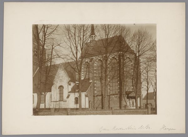 This photograph of Gezicht op de Hervormde Kerk te Hei- en Boeicop was made by an anonymous photographer with unknown materials. The sepia tones in this photo lend a dreamlike quality, almost as if the scene exists just beyond our reach. Notice how the stark, leafless trees create a kind of visual rhythm, their vertical lines both framing and obscuring the church. It’s like the photographer is playing with ideas of what to reveal and what to conceal. The light, diffused and gentle, adds to the overall mood. I'm drawn to the small details—the texture of the church's roof, the way the branches crisscross in the foreground, almost like the strokes of a pen in a drawing. They speak to the enduring allure of simple subjects and the magic that can happen when we truly look. It reminds me of the quiet landscapes of Agnes Martin—minimal, yet full of emotion. Both artists use a kind of repetition and simplicity to invite contemplation.