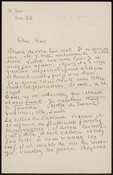 Here’s a letter Emile Bernard wrote to Andries Bonger, and it’s so interesting to see the artist's hand, his process, laid bare like this. The page has a lovely warm tone, the ink a delicate brown, full of movement as he dashes across the page. You can see how the words are formed, the pressure he puts on the nib of his pen, the way it splays and catches, a dance between intention and accident. There’s such fluidity here, a real sense of thought in motion. The way his lines cross each other, almost like a sketch, makes me think of Cy Twombly’s scrawls, and how they embrace imperfection. It's like he's thinking aloud, the words tumbling out in a rush. It reminds me that art isn't just about the finished product, it’s about the messy, imperfect, beautiful process of creation.