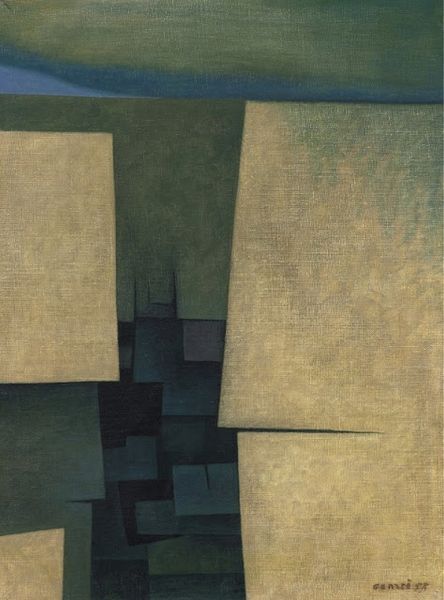 Curator: I find myself intrigued by the sense of arrested motion in this piece; a kind of still choreography. Editor: You're responding, I presume, to Maurice Estève's "Composition," a charcoal drawing from 1955? Its structure gives me a somber impression. The layering of dark charcoal evokes a sense of weight. Curator: Exactly. The interaction of line and form—those darkly rendered geometric masses, juxtaposed with softer, shaded areas—create a powerful spatial dynamic. One immediately decodes how the solid rectangles imply architectural form and depth. Editor: And yet, this type of post-war abstraction reflected a world rebuilding and redefining itself. Do you think this image can be seen in dialog with the international rise of geometric abstraction during this period, especially its resonance with French design? Curator: Certainly. The charcoal allows him to make his drawing evoke the stark geometries of city planning. Note that the texture also lends tactility. Each mark, seemingly casual, is placed with careful deliberation. Editor: Yet that charcoal—a relatively inexpensive medium—also signals something about access and artistic agency in the post-war art world. Was he explicitly responding to societal shifts or just investigating geometric forms through charcoal? Curator: Both. I believe he was deeply engaged with contemporary dialogues regarding form and abstraction, mirroring anxieties and ambitions onto simple forms. The limited palette and heavy reliance on shape invites readings in tension. Editor: In conclusion, this image allows us to read into the power of shape and line. From somber readings to architectural references, one has to ponder if such complex notions were at play when it was drawn. Curator: Precisely! It serves as an excellent example of how we find beauty and nuance in a seemingly rudimentary material as simple charcoal.