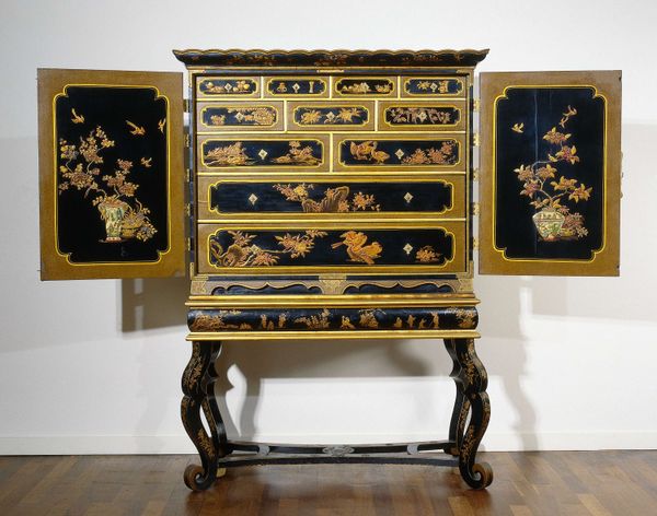 This cabinet was created by Claude Charles Saunier in France, sometime around the late 18th century. It exemplifies the European fascination with Asian aesthetics, a trend known as "chinoiserie," and was a popular motif during that time. This type of cabinet was often commissioned by wealthy patrons, highlighting the class dynamics inherent in artistic production and consumption. The cabinet is made from a black lacquered surface and adorned with gilded bronze mounts and a marble top. Its imagery, featuring flora and fauna, offers an idealized vision of Asia, filtered through a European lens. This orientalism reveals more about European fantasies and projections than any authentic understanding of Asian cultures. Consider the labor and resources involved in creating such an object, reflecting global trade networks and colonial power structures. As you look at this piece, ponder how cultural exchange can sometimes perpetuate unequal power relations.