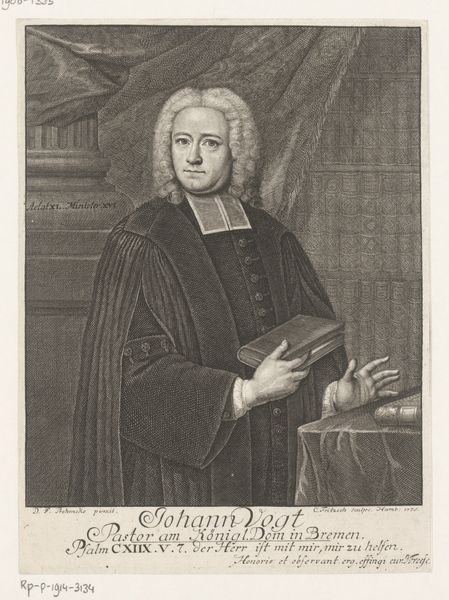 Editor: This is a fascinating engraving! It's a portrait of Theodosius Gottfried Fuchs, created sometime between 1736 and 1767 by Johann Martin Bernigeroth. I'm immediately struck by the figure's direct gaze and the symbolic elements like the book and the curtain. What do you see when you look at this piece? Curator: Well, it is impossible to ignore the open book which presents, at first glance, something quite strange to our modern eyes. But the crossed palms symbolize marital union, referencing Fuchs’s role not only as a minister but the paterfamilias, a provider and protector, charged with ensuring a certain kind of domestic order. How interesting it is that religious calling and domestic role could be represented in this manner. What does the gesture convey to you? Editor: That’s fascinating! The hand gesture…it almost feels like he's presenting the book to us, the viewers. Maybe as if he’s saying "This is my doctrine; judge me by it"? Curator: Perhaps, or to consider the historical frame and his profession. Is it possible that the open book is as much of a performative tool, akin to how a Baroque artist employed the open curtain, offering us insight into an inner world, a sanctum? The portrait suggests a curated display of identity. What does this choice of composition reveal about Fuchs and the cultural values of his time? Editor: I guess it speaks to the importance of religious authority and knowledge then? It makes you wonder how much control Fuchs had over this representation of himself. Curator: Precisely. Considering such details enhances our comprehension of not only the individual but also the era's visual and societal symbols. Editor: I hadn't considered the image as an intentional construction. It gives the engraving an entirely different, richer dimension.