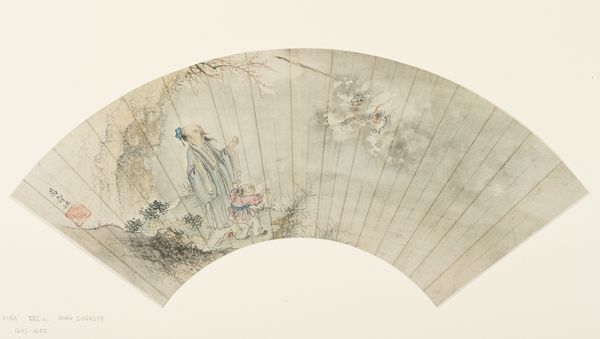 This fan, entitled "Two Scholars and Boy with Goose," attributed to Sun Rong, is painted with ink and color on paper. The paper itself has been carefully prepared with radiating ribs that provide both structure and a subtle texture to the artwork. The choice of a fan as a medium is significant. Fans like this one were not merely utilitarian objects, but also status symbols, often associated with the literati class in China. The subject of the painting – two scholars accompanied by a boy and a goose – speaks to this association, reflecting a life of leisure and intellectual pursuit. The ink and color are applied with a light touch, allowing the paper's inherent qualities to show through. Note how the subtle gradations of ink wash create a sense of depth and atmosphere, while the delicate brushstrokes define the figures and landscape. This fan represents the fusion of artistry and everyday life. The fan challenges our traditional distinction between fine art and craft.