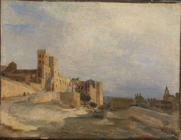 Editor: This watercolor, titled "Tomb at Assouan, Egypt," really captures a sense of decay and stillness. What symbols or meanings do you find particularly striking in this piece? Curator: The ruined structure, rendered in muted tones, immediately evokes a sense of temporal passage. Notice how the artist positions the figure in blue against this backdrop. What do you think that contrast might signify? Editor: Perhaps it's a reminder of human presence against the weight of history? Curator: Precisely. The blue figure, possibly a modern traveler, becomes a symbol of our ongoing engagement with the past and the cultural memory embedded within these ancient sites. The ruin is not merely a physical space but a repository of stories and experiences. Editor: That’s a great point. I now see how the artist uses color and form to bridge the gap between then and now. Curator: Indeed, it’s a delicate dance between presence and absence, memory and reality.