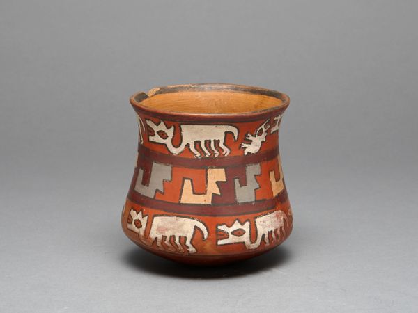Editor: Here we have a "Globular Jar in the Form of a Cat," a ceramic piece from the Moche culture, dating back to around 100-500. The way they’ve blended function and form is quite interesting. What stands out to you about the production of this piece? Curator: Well, it’s important to think about where the clay comes from. The Moche didn't have potter's wheels, so each vessel was shaped by hand or using molds. The surface finishing and painting— how might those aspects reveal about the level of social stratification and labor investment involved in its creation? Editor: That’s a great point. I hadn’t considered the social implications. It makes you wonder who was making these vessels. Were they artisans or simply laborers? Curator: Precisely! Think about the firing process as well. Was it fired in an open pit or a more controlled kiln? The consistent color suggests skillful control of the firing conditions. This wasn't just a functional object, but something meant to last, and to signify. What was this cat, as raw material turned art, meant to signify in Moche society? Editor: The decorations and form give a symbolic dimension that’s clearly linked to Moche beliefs about the natural world. Maybe this particular vessel was linked to ritual practice? Curator: Yes, precisely! It's crucial to examine the relationship between the material properties of the ceramic and the symbolic representation of the cat to decipher the object's original function. Thinking materially allows a connection to broader cultural meaning of this interesting object. Editor: So it's the material itself – its creation and form – that gives us access to understanding its cultural significance? That's fascinating. Curator: Indeed! Examining the materials helps us unravel the intricate threads of Moche life, labor, and belief systems that have resulted in such remarkable object.