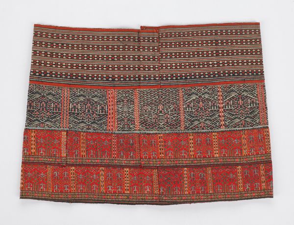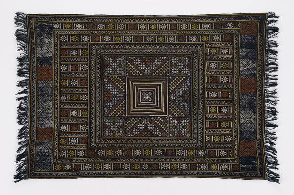 Editor: Here we have a gorgeous textile, an Ikat-dyed Blanket, crafted sometime between 1875 and 1900 by the Iban people, currently housed here at The Art Institute of Chicago. There's this really interesting, almost dreamlike quality to the repeated patterns in earthy reds and browns...it's both comforting and a bit mysterious. What jumps out at you when you look at this, considering its history? Curator: Well, immediately, the warp and weft of human experience become so tangible, don't they? It whispers stories of connection. Each thread embodies generations mastering the art of dyeing before weaving, stories of community and resourcefulness. Editor: Dyeing before weaving? What does that mean? Curator: Yes! Ikat is created by resist-dyeing the threads *before* weaving begins. The skill is knowing exactly how a pattern will appear *after* the cloth is constructed. It's incredible forethought. Imagine, a painter creating an image, brushstroke by brushstroke, while only seeing fragments of colour on individual threads. How incredible is that?! Editor: That *is* incredible. It speaks to how mathematical this weaving must be, planning out a full image in a very abstract way. And yet the overall effect, as a blanket, feels quite free-flowing. Curator: Exactly! It reminds us that even within precise systems, artistry blossoms. This textile bridges the planned and the perceived. It invites you in close, almost embracing you within a maze of ancient secrets and untold stories. Does this spark new perspective? Editor: It really does. Seeing that blend of calculation and artistry, well, I won’t be able to look at textiles the same way again. Thanks for revealing this! Curator: My pleasure! May the thread of curiosity always guide your way.