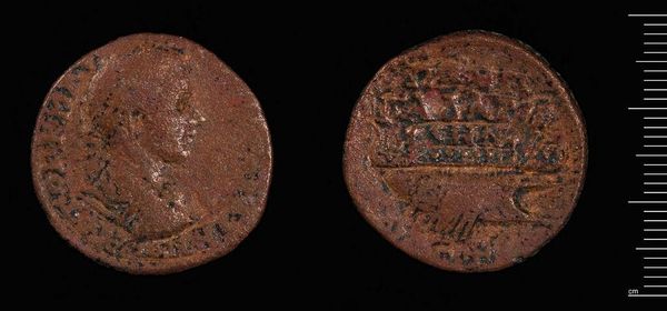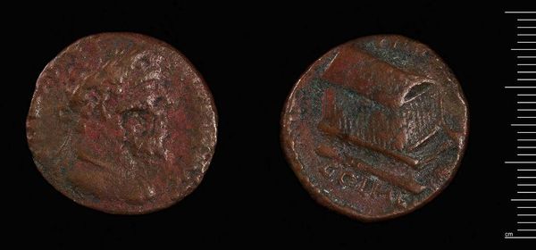 Editor: So, this is a Roman Sestertius of Faustina I. Looking at this coin, I’m struck by the way time has worn it down, yet her image still persists. What story do you think it tells? Curator: Well, imagine holding power, legacy, all imprinted on a humble coin! For me, it whispers of an empire's vastness, and a woman's enduring influence. The temple depicted… it's a symbol, wouldn't you agree, of permanence, of values meant to last? Editor: Absolutely, a powerful representation. I hadn’t thought about the temple that way, more as just architecture. Curator: It's like a tiny stage, isn't it? Showcasing what they wanted the world to remember. What do you feel looking at it now? Editor: I get that now. A tiny monument, cleverly designed. Curator: Exactly! Each coin, a miniature propaganda piece.