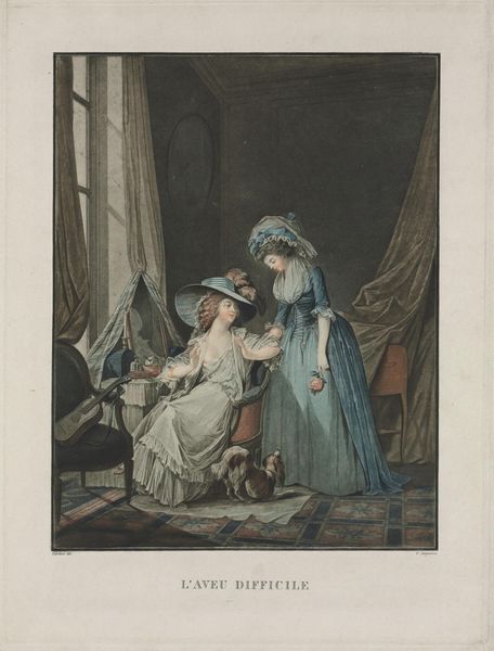 Editor: This is Henri Nicolas van Gorp's "Le Déjeuner de Fanfan," which translates to "Lunch for the Precious One." The watercolor shows a lady bringing a baby into a room. It feels so intimate, almost like a peek into a private moment. What’s your take on this scene? Curator: It's a dance of domesticity, isn't it? I imagine the artist capturing a fleeting moment of warmth and familial affection. The almost theatrical lighting—see how it highlights the figures?—amplifies that feeling of intimacy. Do you notice the objects around the room? Editor: Yes, the clock, the bust, the lavish clothing... Curator: Exactly. They seem to speak volumes about the sitters' status, but they also suggest the interiority, the emotional landscape, of the scene. It's a delicious combination of social commentary and personal tenderness. Editor: I hadn’t thought about it that way. Seeing it as a combination of status and emotion really changes things. Curator: Art often invites us to see more than meets the eye. It's a skill, isn't it? To look closely, feel deeply, and then maybe…understand a little bit better.