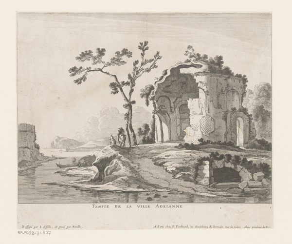 Editor: Here we have Jan Gerritsz van Bronckhorst's etching, "Ruïne van Boog van Constantijn te Rome," placing us somewhere between 1613 and 1661. The scene depicts the ruins of the Arch of Constantine amidst what looks like a pastoral landscape. It's striking how the remnants of imperial grandeur are juxtaposed with grazing cattle. What symbols stand out to you in this piece? Curator: The ruin itself, the Arch, isn't simply stone; it's a vessel teeming with cultural memory. It speaks of power, victory, and the once immutable nature of empires. Note how nature reclaims the space, vines crawling over carved stone. This echoes the ephemeral nature of human endeavors, set against the enduring backdrop of the natural world. Do you notice the oxen in the foreground? Editor: Yes, they seem oblivious to the historical weight of the arch. Curator: Precisely. They symbolize the continuation of life, agriculture, and a cyclical rhythm unaffected by the ambitions and collapses of empires. The figures in the roundels above seem eroded and lost, like figures from a fading dream, or half-remembered gods. What might that signify? Editor: Perhaps the loss of specific stories, a forgetting of the original purpose and details. It speaks to a broader amnesia. Curator: Consider the artist's choice to present the Arch as a ruin rather than in its former glory. This very act of choosing the ruin reframes the past. Bronckhorst prompts reflection on legacy and on what persists through time versus what is lost. How does the Baroque landscape around it contrast or complement the message in the triumphal arch itself? Editor: It creates a poignant contrast between human ambition and nature's indifference, reminding us that even the most powerful structures eventually crumble and return to the earth. I now understand that Bronckhorst uses imagery here not just to depict, but to convey complex layers of cultural and historical understanding. Curator: Indeed, and the Arch's continued presence, even in decay, speaks volumes about the enduring power of symbols to transmit ideas and emotions across generations. A ruin remains a cultural text.